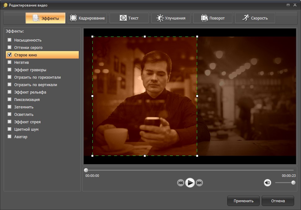Примените к видеозаписи оригинальные фильтры, превращая её в старинное кино или загадочную гравюру. Вы можете взять сразу несколько эффектов, отметив нужные галочками. Используйте такие комбинации, чтобы добавить "изюминку"