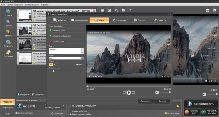 Вкладка Текст в окне редактирования позволяет наложить текст на видео — добавлять смешные подписи, выбрав их шрифт, стиль, цвет и прозрачность. Также можно загрузить и добавить изображение, настроить его размер, положение и прозрачность.